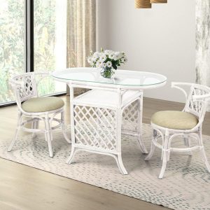 Borneo Compact Dining Set White Color, Table with Glass Top + 2 Chairs with Cream Cushions, Handmade Natural Wicker Rattan Furniture