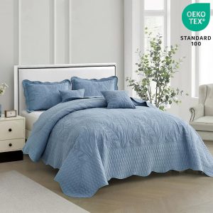 Botanical Oversized Bedspread King Size – Leaves Pattern Stitching Quilt Set – Elegant & Fresh Style Bedding Coverlets, Reversible, Lightweight, 4 Piece, Ashley Blue