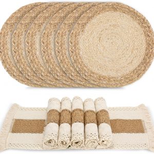 Handmade Boho Placemats Set of 6 – Natural Cotton Burlap and Water Straw Woven Combination Table Mats, Macrame Décor and Farmhouse Style Placemats, for Dining Table Kitchen