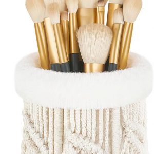 Mkono Macrame Makeup Brush Holder Boho Organizer Plush Lined Woven Basket Comb Brushes Mini Storage Home Decor for Glasses Pen Pencil Box Container, Ivory