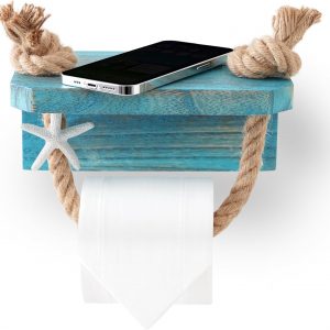 Nautical Rope Toilet Paper Holder Blue Farmhouse Bathroom Decor – Wall Mount Starfish Coastal Beach Rope Towel Holder Towel Rack Unique Rustic Tissue Roll Holder with Wood Shelf
