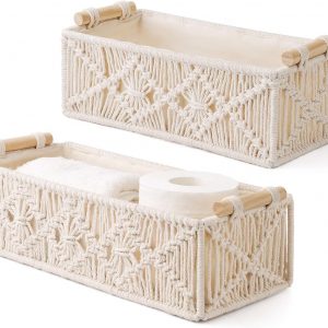 Mkono Macrame Storage Baskets Boho Decor Box Handmade Woven Decorative Countertop Toilet Tank Shelf Cabinet Organizer for Bedroom Livingroom Home, Set of 2, Ivory