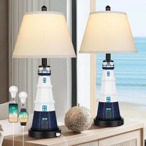 Modern Lighthouse Table Lamps Set of 2, White Navy Blue Bedside Nautical Table Lamp, Nautical Style Resin Reading Lights for Bedroom Livingroom, Bulbs Included