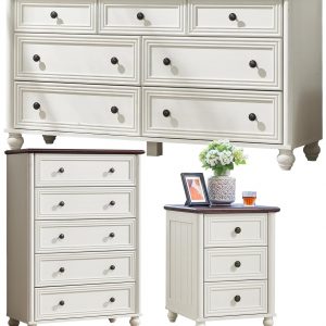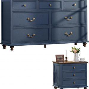 Farmhouse Dresser and Nightstand Sets, Wooden 7 Drawers Dresser & 24″ Night Stand with 3 Drawers, 2 Piece Bedroom Furniture Set, Chest of Drawers for Bedroom, Home, Living Room, Hallway