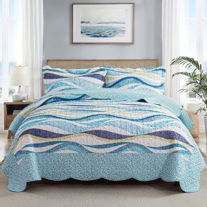 HoneiLife California King Quilt 120×120 – Beach Quilt 3 Pieces, Coastal Quilt Sets, Oversized King Bedspreads, Nautical Bedspreads Ocean Coverlets, Lightweight Bed Cover, Summer Quilts