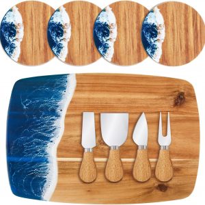 Patelai 9 Pcs Ocean Resin Cutting Board Set with 4 Cheese Knives and 4 Coasters for Wedding Housewarming Gifts, Blue White Wave Pattern Charcuterie Board Kitchen Meal Prep Serving Versatile Cheese