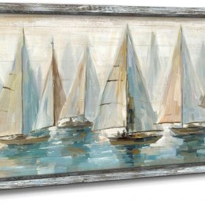 Ocean Pictures Wall Art Framed: Beach Seaside Artwork Coastal Sailboat Art on Wooden Seascape Painting for Living Room(60×30)