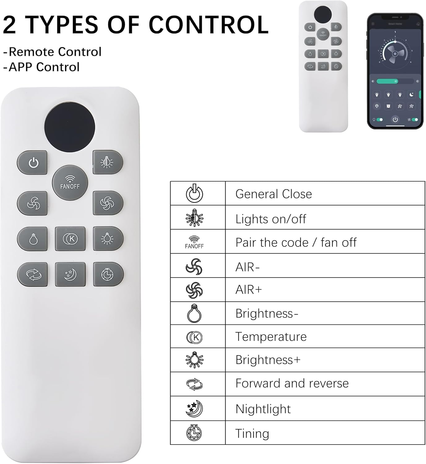- [Convenient Dual Smart Control]:Experience the ultimate convenience with this palm leaf ceiling fan’s remote and APP control functionality. Seamlessly switch between 6 wind speeds, reverse the fan direction for seasonal comfort, and set 1-4-8 hour timers. Adjust the fan speed and lighting anytime, anywhere, making it a must-have for modern smart homes.