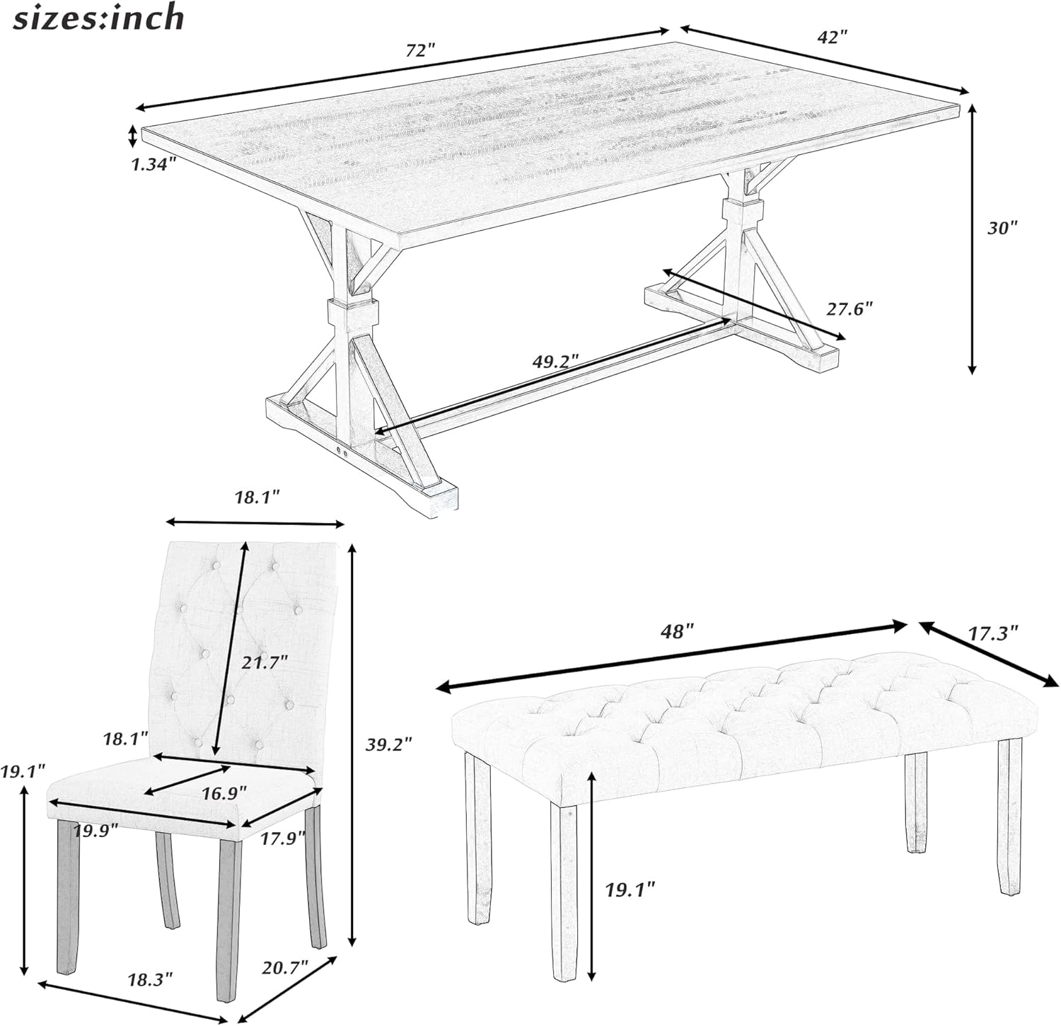 - 【6-Piece Solid Wood Dining Table Chairs Set】 This Exquisite 6-piece dining set set includes one 72″ table, four Upholstered dining chairs, and a Upholstered bench in a beige finish that pairs well with any contemporary aesthetic. Whether hosting a dinner party with close friends or enjoying an everyday meal with the family, this 6-piece rubber wood solid wood dining set is a must-have for your home.