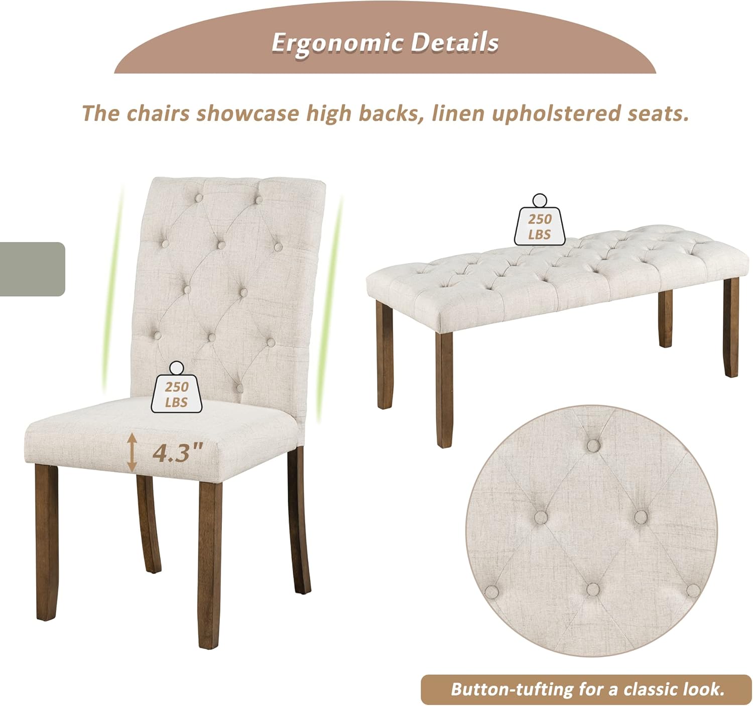 - 【Comfortable Upholstered Chairs & Ergonomic Design】 The chairs showcase high backs, linen upholstered seats, and button-tufting for a classic look. The chair’s ergonomic curved back and 4.3″ thickness soft cushion, matching a 48″ length bench, provide a comfortable experience in daily usage. The load-bearing capacity of chair and bench are 250lbs.