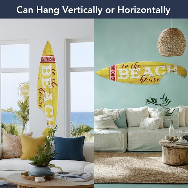 - From Bedroom to Beach House – Our surfboard wall decor effortlessly adapts to any room in your home, whether it’s the bedroom, living room, kitchen, bathroom, or guest room. Its coastal charm & classic design make it the perfect addition to your beachfront house or vacation home.