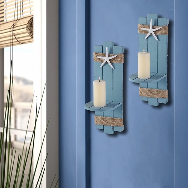 - Beach boho wall decor – This sea blue set of wall Candle Sconces brings together a strong vintage vibe with a beach twist. With its Chic design, add an eye-catching look to any space with this fabulous pair of wall sconce candle holders.