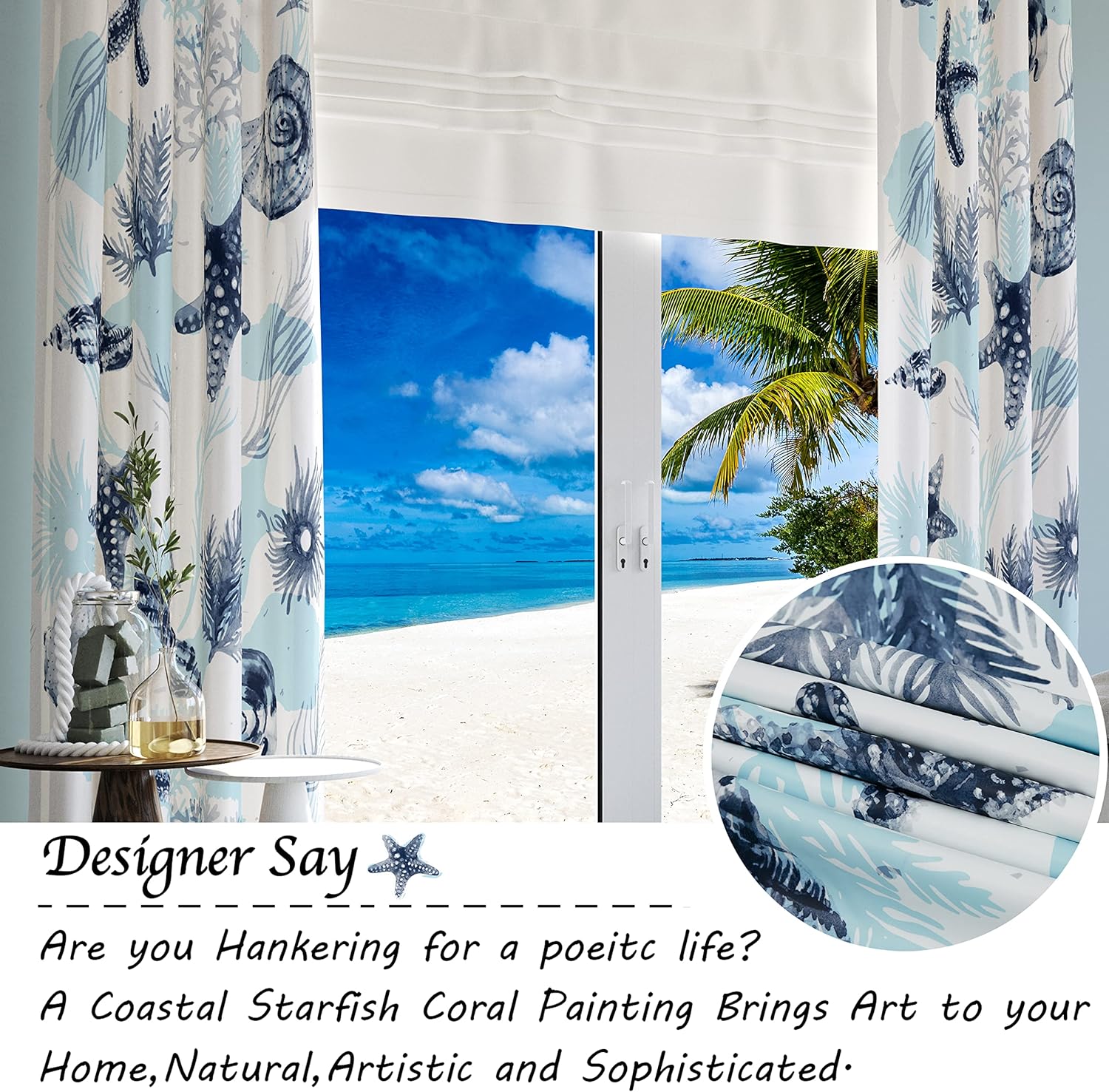 Coastal Nautical Curtains Blue and White Beach Sea Starfish Seashell 50% Light Blocking Curtains Ocean Theme Coral Print Window Drapes Decor for Living Room Bedroom Nursery, 2 Panels, 52×96 Inches