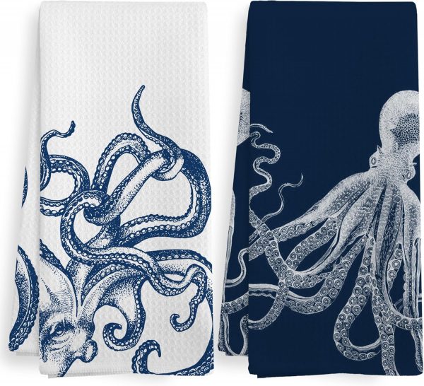 Coastal Octopus Beach Decor Dish Hand Tea Towels for Bathroom Kitchen, Octopus Ocean Nautical Beachy Bathroom Decor, Coastal Nautical Kitchen Towels and Dishcloths Sets of 2, 16×24 Inches