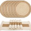 • SUPERIOR QUALITY PLACEMATS: Made of 100% natural materials. Soft skin-friendly cotton with tassels, and hollow stripes woven from burlap, it will add that just right dash of rustic chic decor. And the round placemats are hand-woven from high-quality water hyacinth and corn husk materials, which are non-slip, heat-resistant and anti-scalding while providing maximum protection for your table