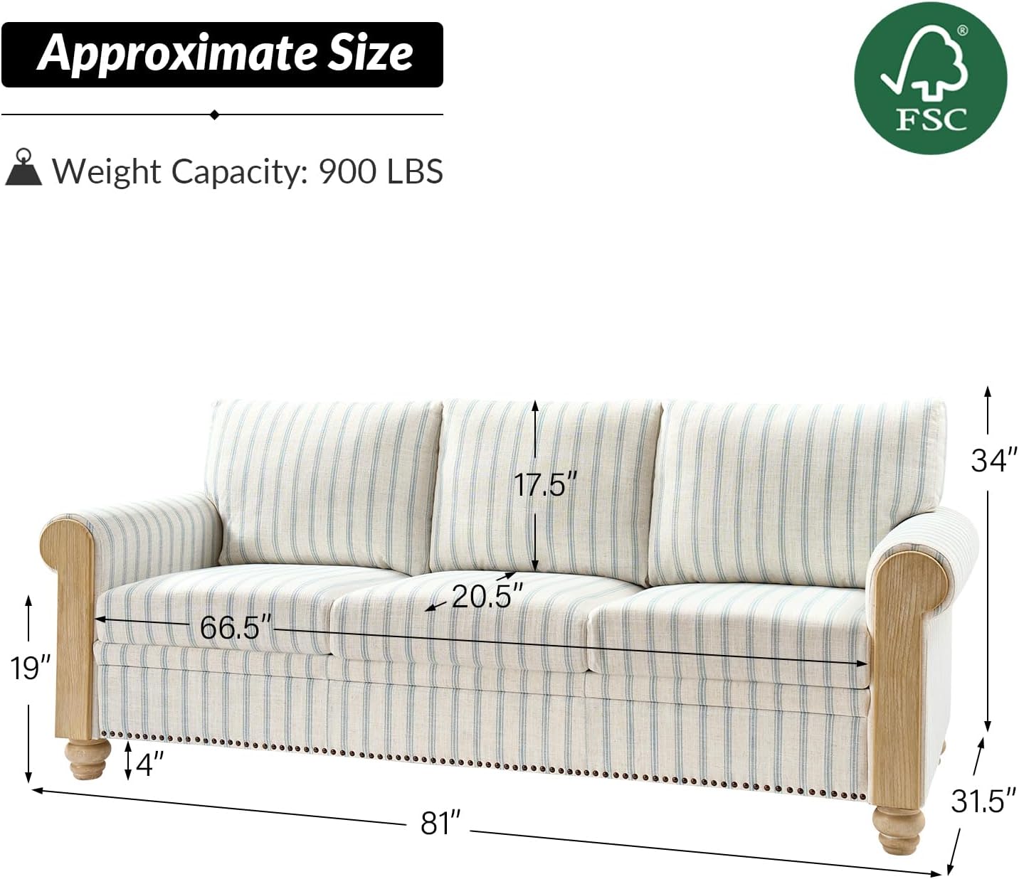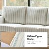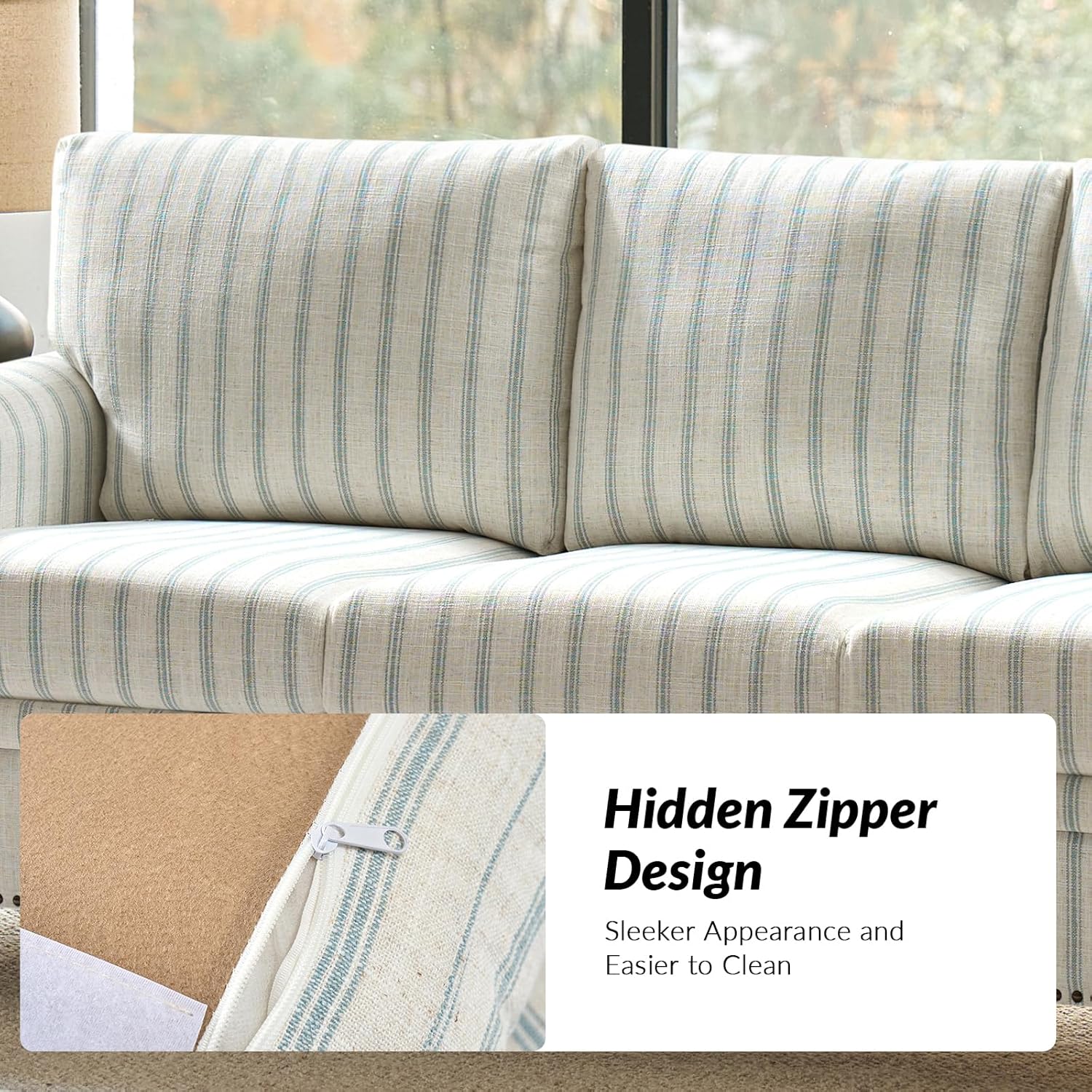- Striped Linen Fabric: Upholstered in a stylish striped linen fabric, this farmhouse style sofa combines comfort with visual appeal. The natural texture of the linen adds depth and character, while the stripes create a classic, yet modern, visual statement, perfect for a variety of interiors.