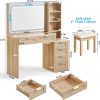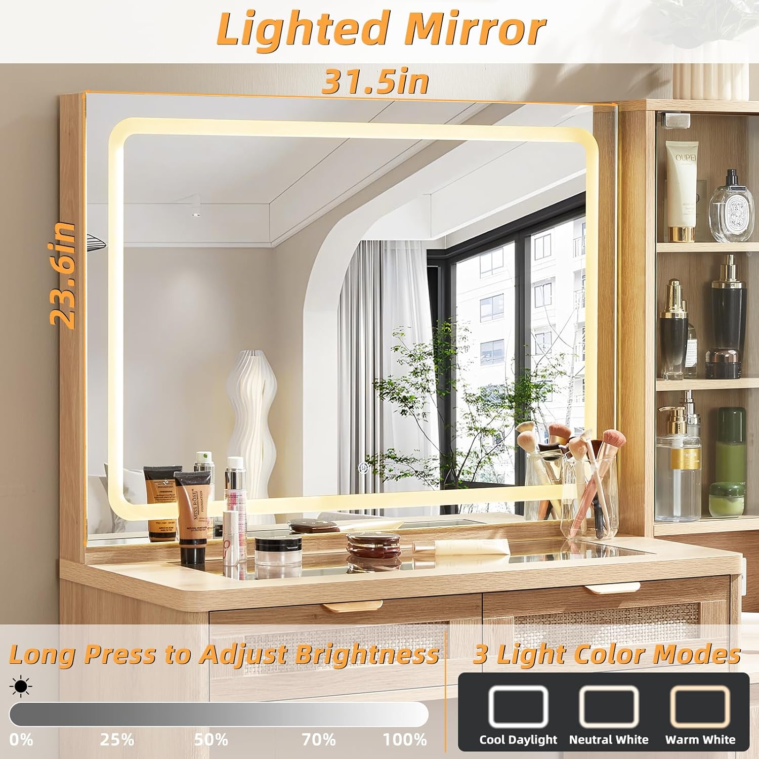 - Rattan Vanity Desk with Stool, Mirror, Lighting, Charger : This makeup vanity features exquisite rattan craftsmanship, perfect for creating a natural and cozy atmosphere.With a large mirror and adjustable lighting and the matching chair, this rattan vanity looks flawless from every angle. The built-in charger allows every woman to style herself while watching her favorite shows. The light from the illuminates the glass tabletop, making your watches and jewelry in the drawers sparkle brilliantly.