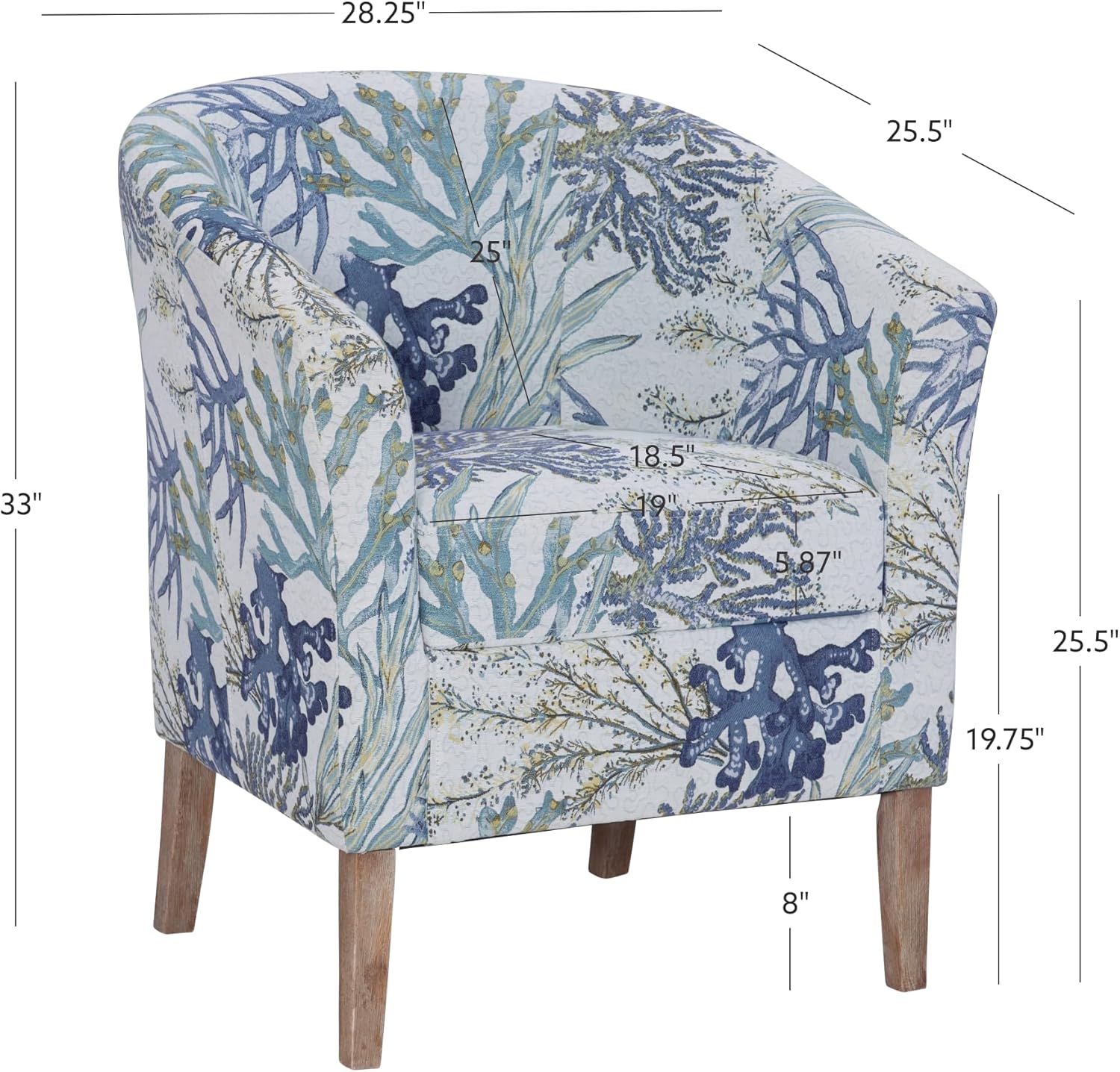 - Coral print in different shades of blue contributes to the easy going nature of a seaside paradise.