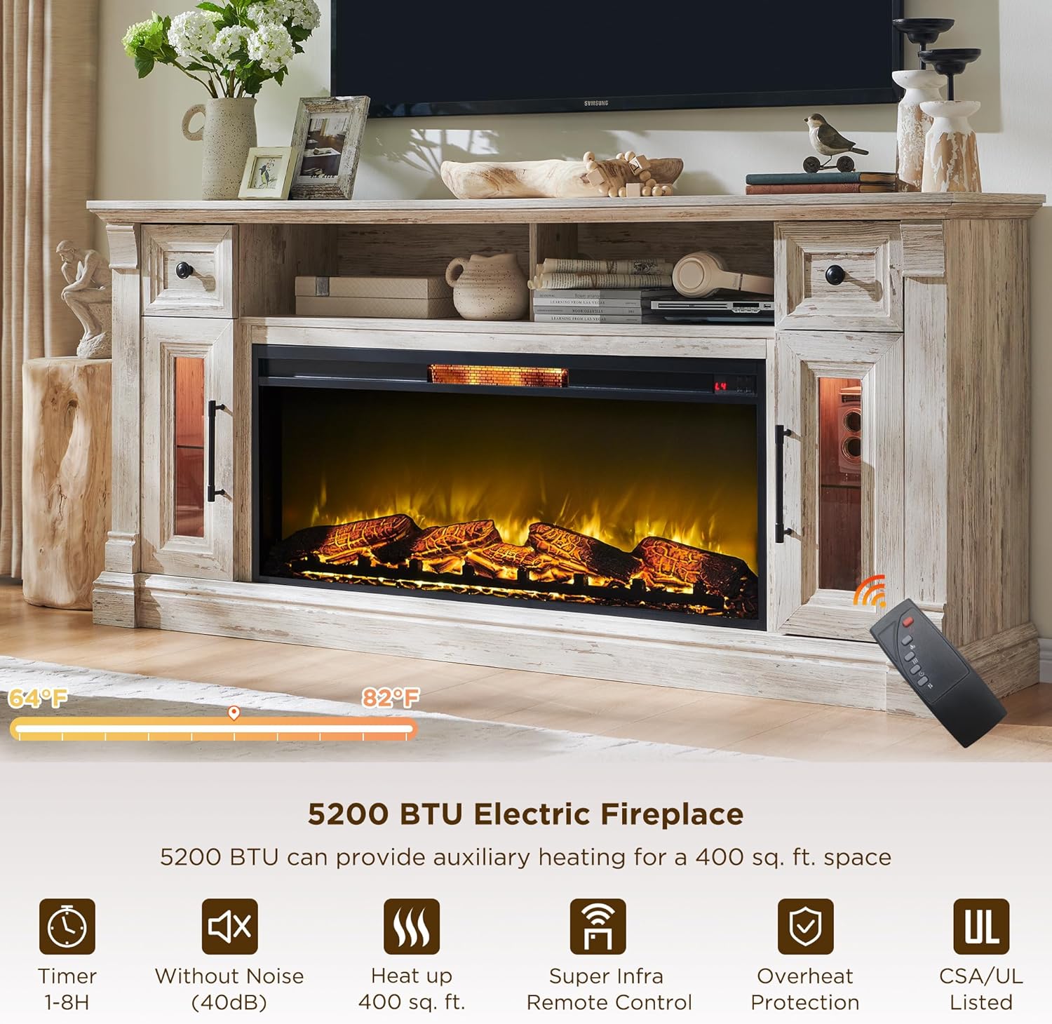 • Ample and Flexible Storage: With a 70″ wide tabletop that accommodates TVs up to 80 inches, this stylish fireplace entertainment center offers versatile storage solutions. It includes an open cubby and two small drawers for your media consoles, records, or books. The two side cabinets feature adjustable shelves, allowing you to customize the space to fit your needs. Additionally, the sturdy base and built-in wire management holes ensure a clean and organized appearance