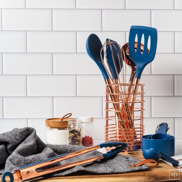opper and Blue Silicone Cooking Utensils Set – 17-Piece Set with Copper Utensil Holder and Measuring Cups and Spoons for Stylish Cooking and Baking – Blue Kitchen Decor, Unique Kitchen Gifts