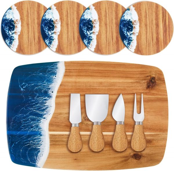 - Complete Set for Culinary Creations: includes 1 Ocean Wave Cheese and Meat Cutting Board, 4 Ocean Wave Coasters, and 4 Cheese Knives for Charcuterie Board arrangements
