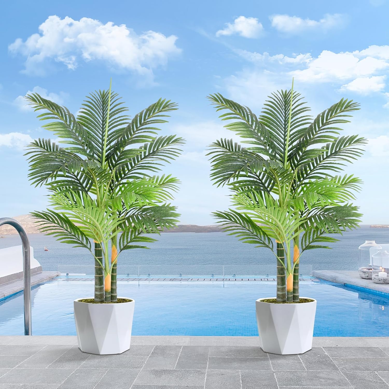 - 🌴Realistic Appearance: This 4 feet majestic triple tropical golden cane palm artificial tree has 16 large vivid fronds filled with countless arching feather-like leaves with realistic palm texture, three lifelike bamboo trunks are very strong, it looks so lush and great, it will create a tropical paradise atmosphere for you and those around you, now this extra tall triple cane palm tree is waiting to dance in the warm tropical breezes